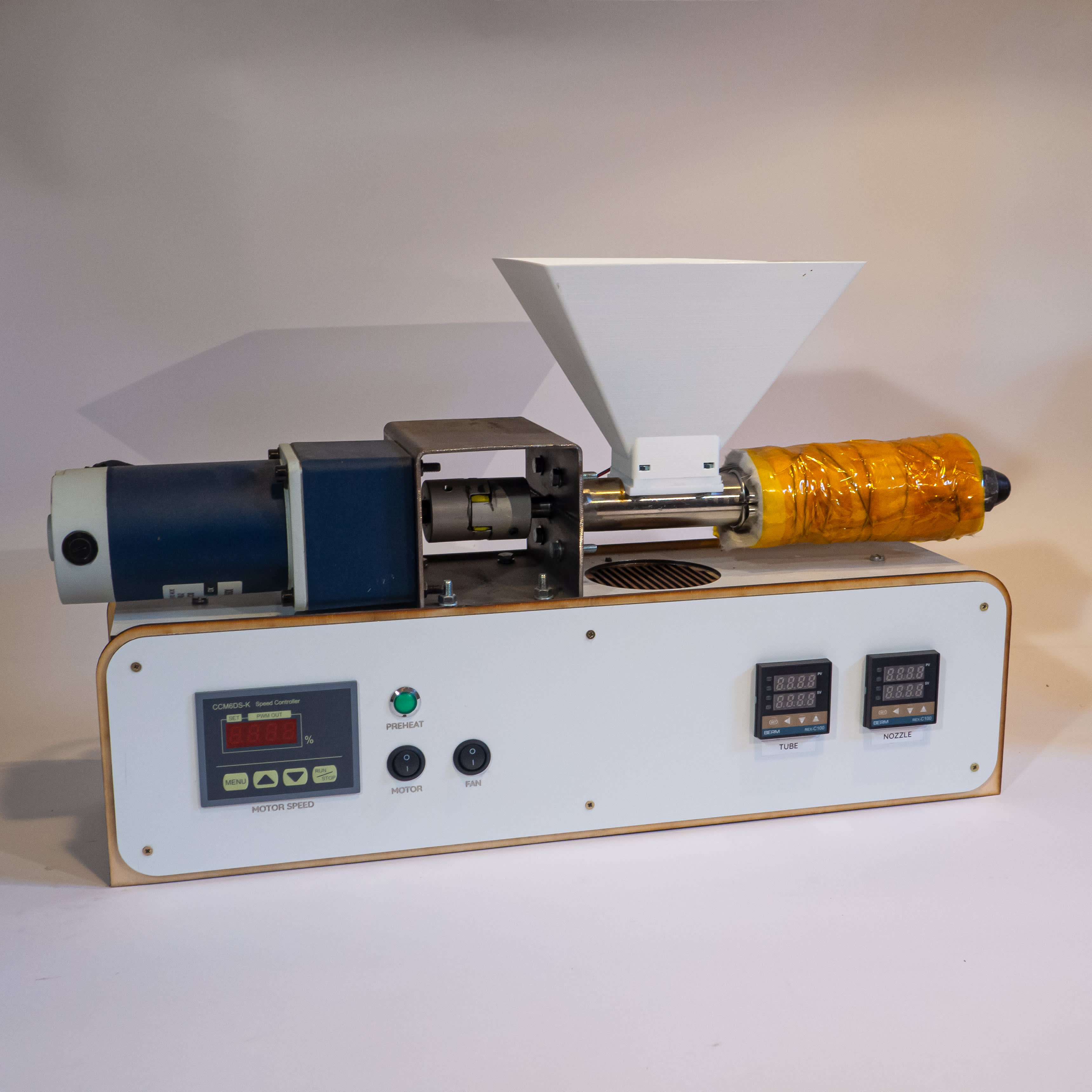 Ces machines, inspirées du projet Precious Plastic initié par le designer Dave Hakkens, ont été créées avec l'objectif d'offrir une version compacte, peu coûteuse, techniquement accessible et open source d'une extrudeuse de filaments avec un enrouleur de bobine.