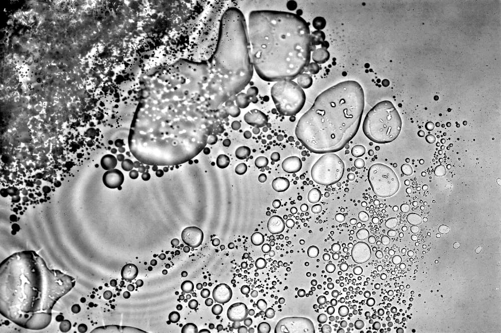 Une feuille de papier photosensible est placée dans un bac rempli d’eau - Une perturbation vient créer des ombres sur la feuille, comme au fond d’une piscine - L’image est saisie en utilisant la technique du photogramme avec un flash.
