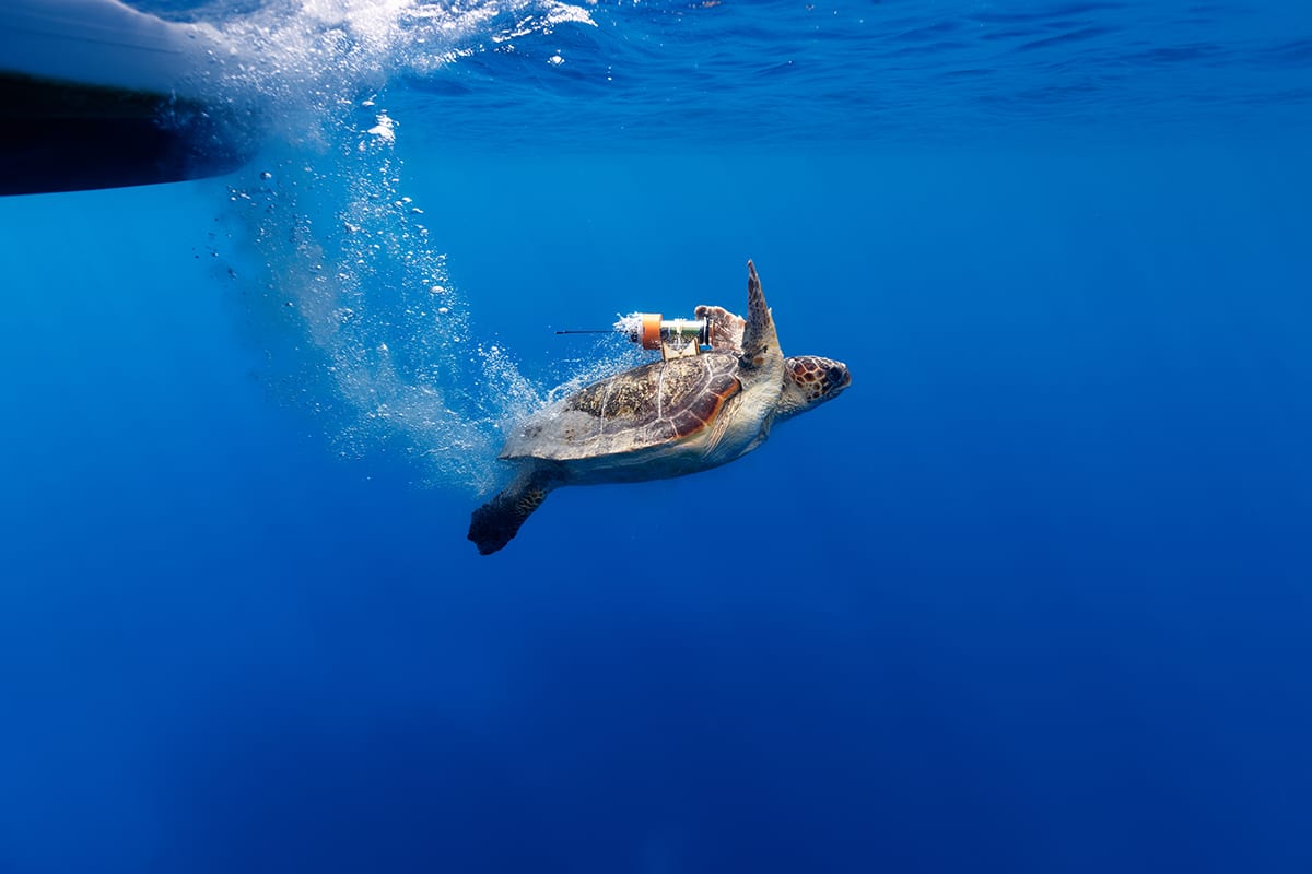 La balise est aujourd'hui fixée à l'aide d'un berceau en contreplaqué collé à la carapace. Elle se détache grâce à une anode corrodable qui libère la tortue au bout d'un temps déterminé. Une fois à la surface, la balise transmet sa position approximative par satellite et émet un signal régulier en Lora, qui permet de la retrouver précisément par télémétrie à l'aide d'une antenne Yagi.